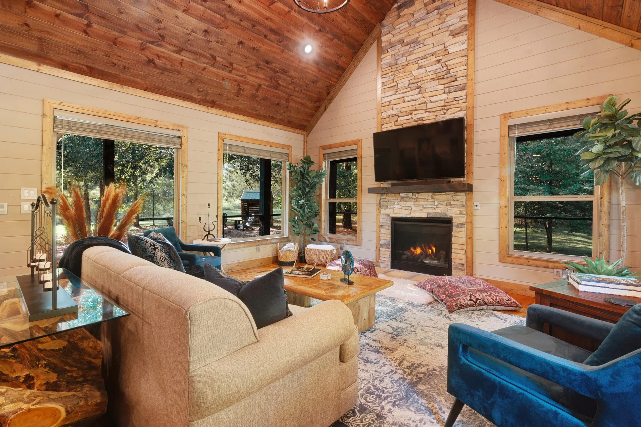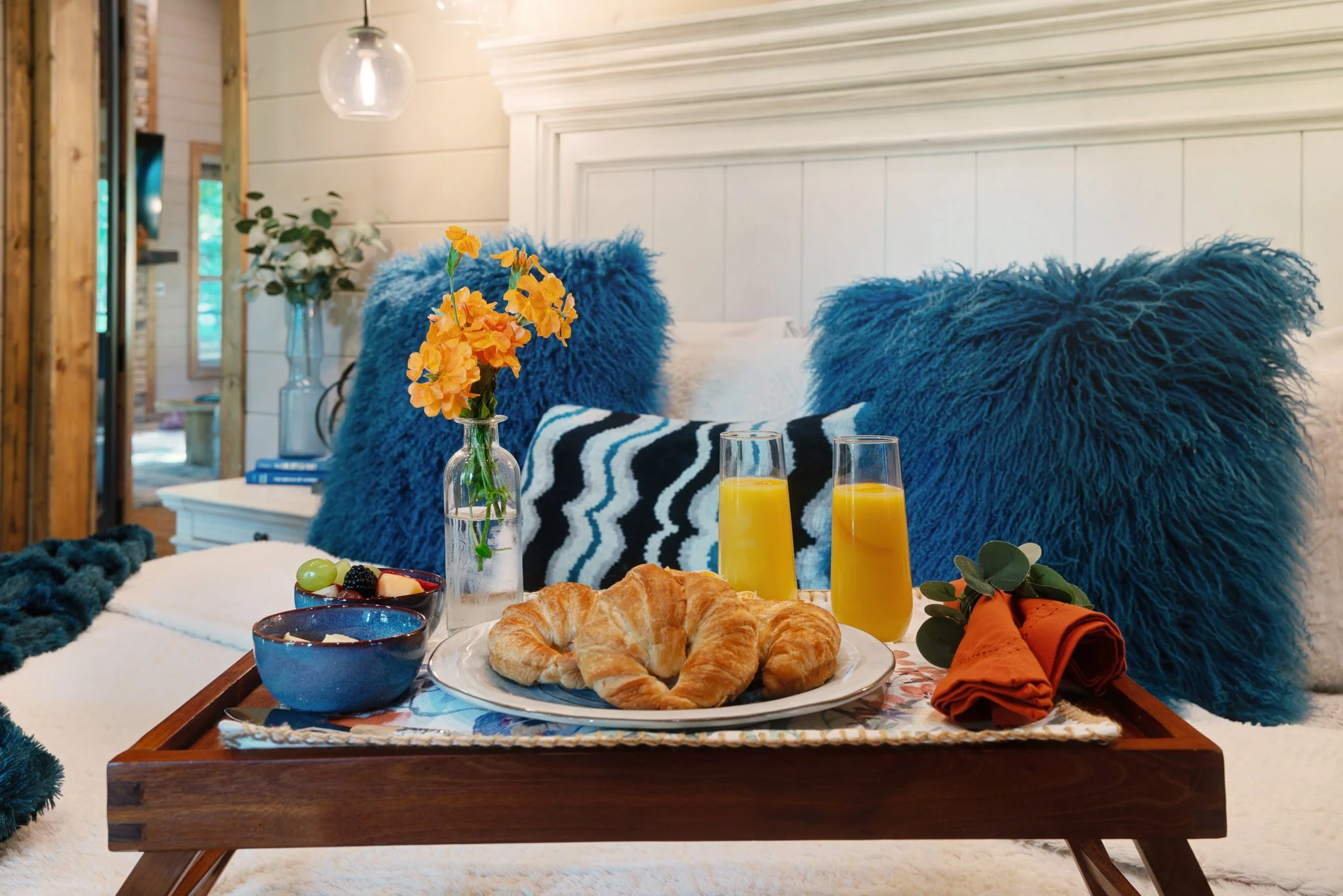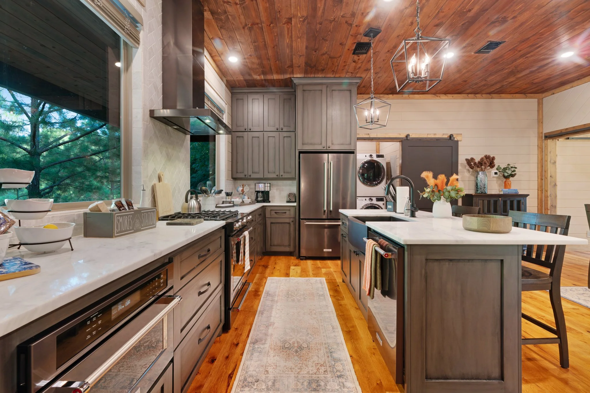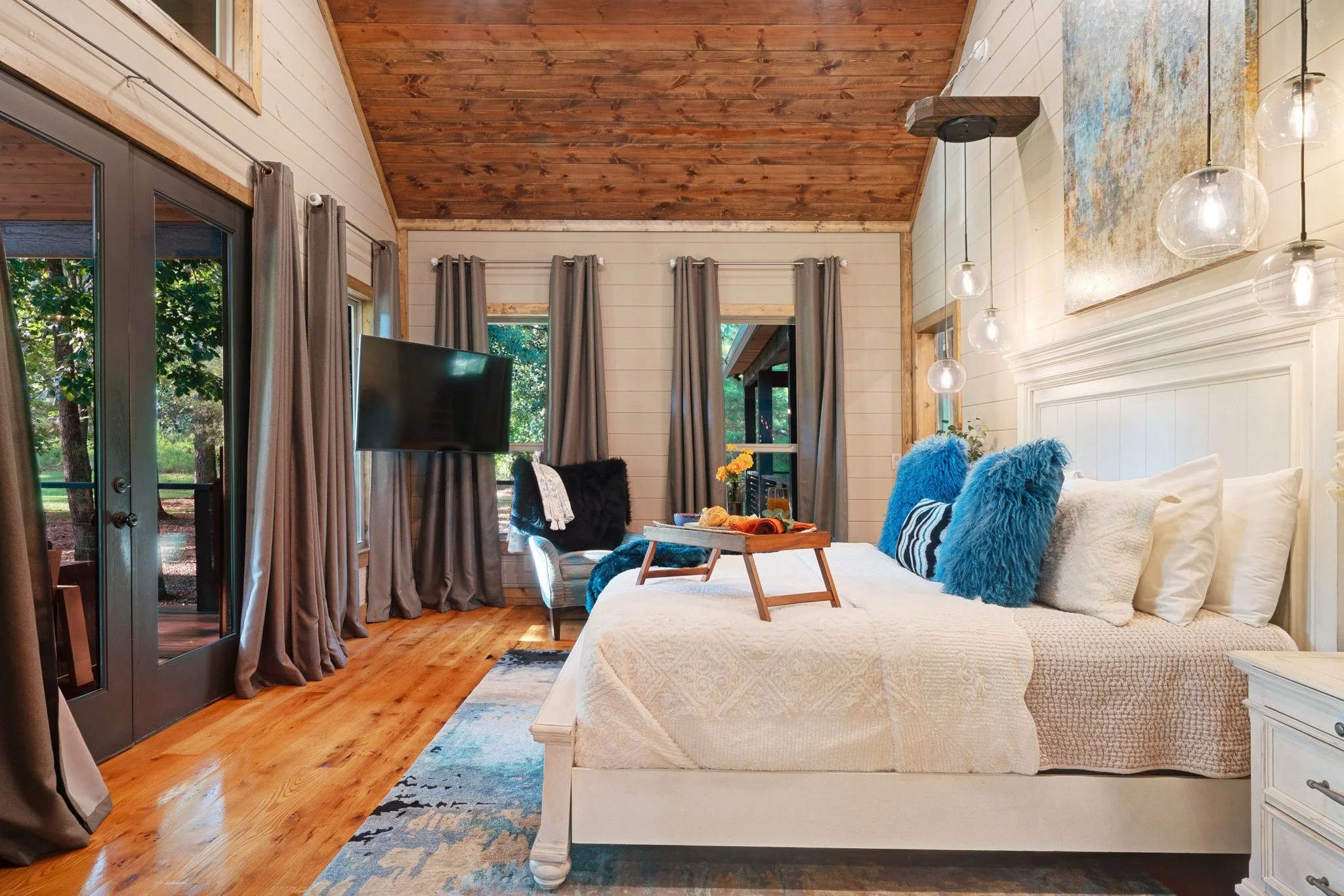 The sixteen-foot ceilings and open concept design of this two-bedroom cabin make it feel spacious while the indoor fireplace and the décor offer a cozy, intimate feeling at the same time. The kitchen, dining, and living areas are all open to each other—providing the perfect place for guests to gather with friends and family. The living room is set up with a sixty-five-inch flat screen smart T.V. with DirecTV connection and a Bluetooth compatible soundbar. The kitchen is equipped with all stainless steel Kitchen Aid appliances, quartz countertops, and stocked with cooking and serving utensils for guests to prepare a full meal. Gray Fox also offers a full coffee bar with a small starter kit to get you through your first morning.