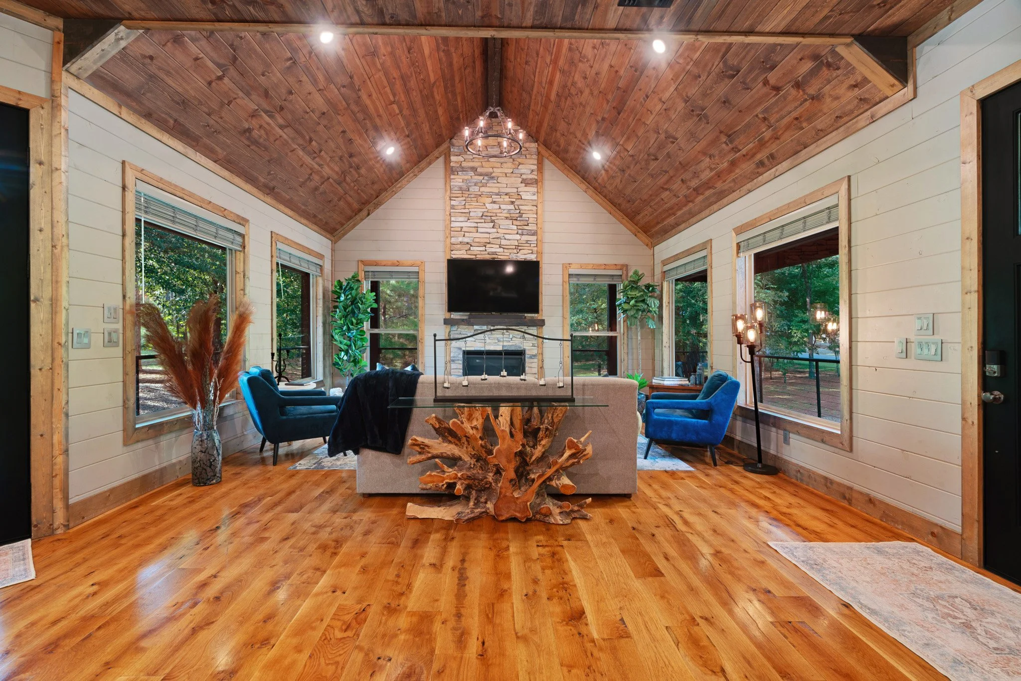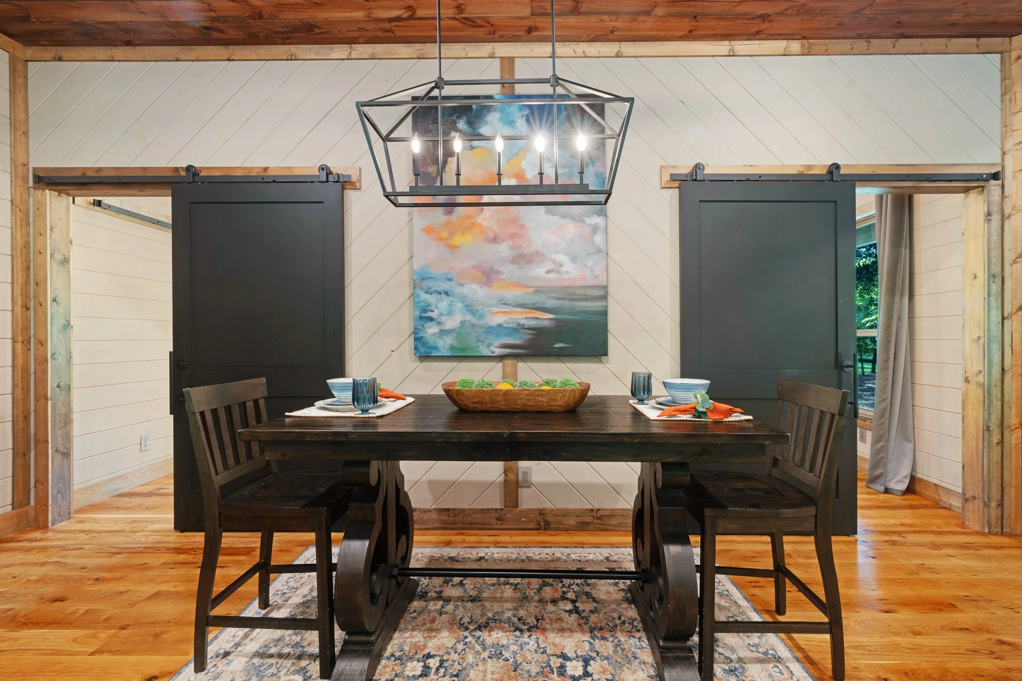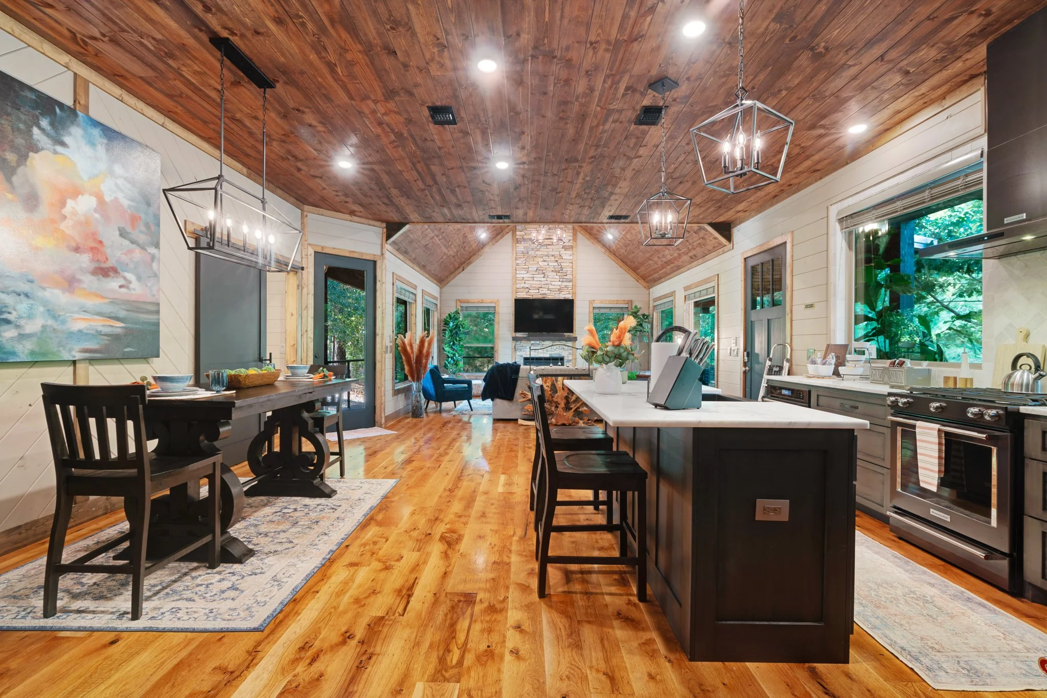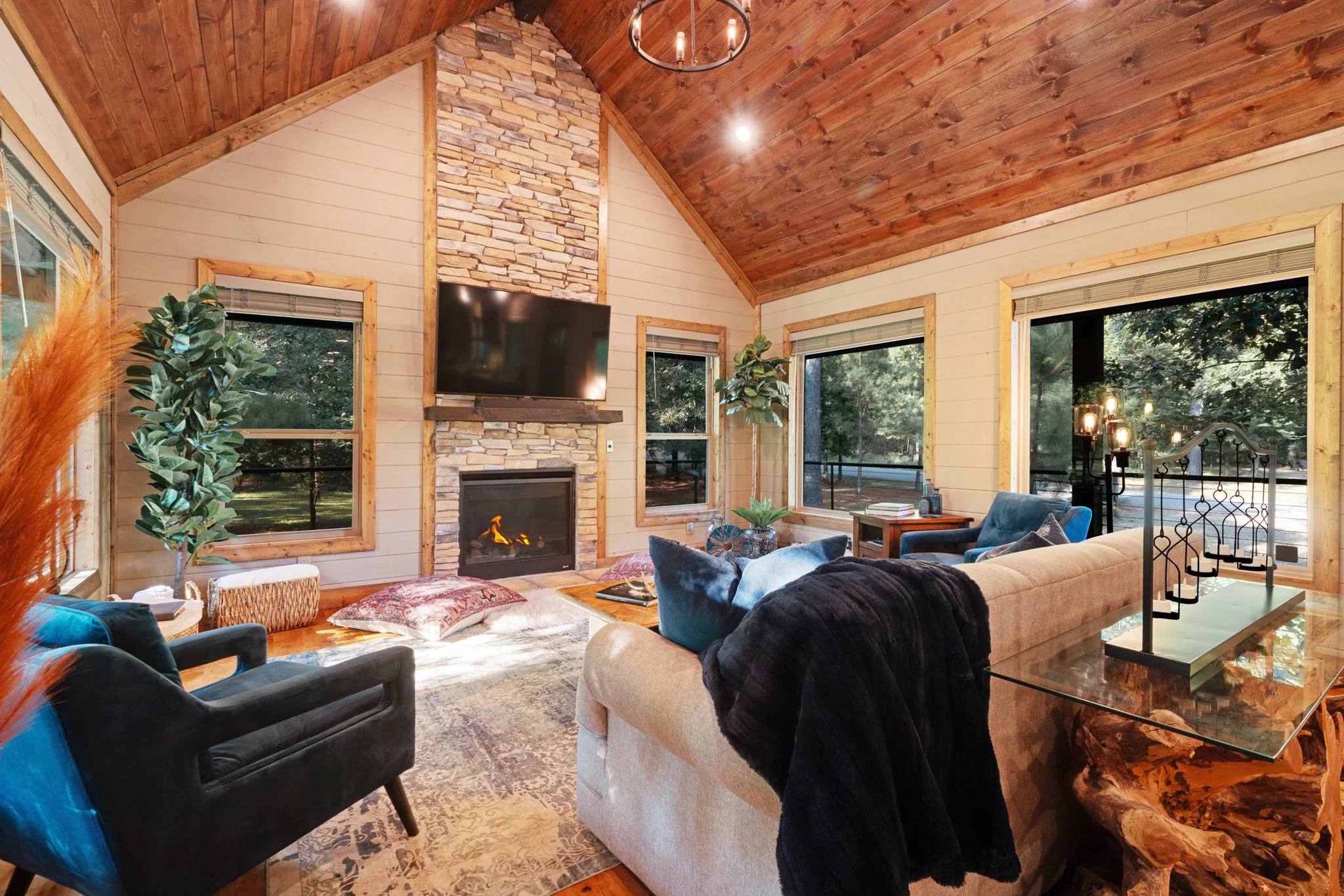 The sixteen-foot ceilings and open concept design of this two-bedroom cabin make it feel spacious while the indoor fireplace and the décor offer a cozy, intimate feeling at the same time. The kitchen, dining, and living areas are all open to each other—providing the perfect place for guests to gather with friends and family. The living room is set up with a sixty-five-inch flat screen smart T.V. with DirecTV connection and a Bluetooth compatible soundbar. The kitchen is equipped with all stainless steel Kitchen Aid appliances, quartz countertops, and stocked with cooking and serving utensils for guests to prepare a full meal. Gray Fox also offers a full coffee bar with a small starter kit to get you through your first morning.