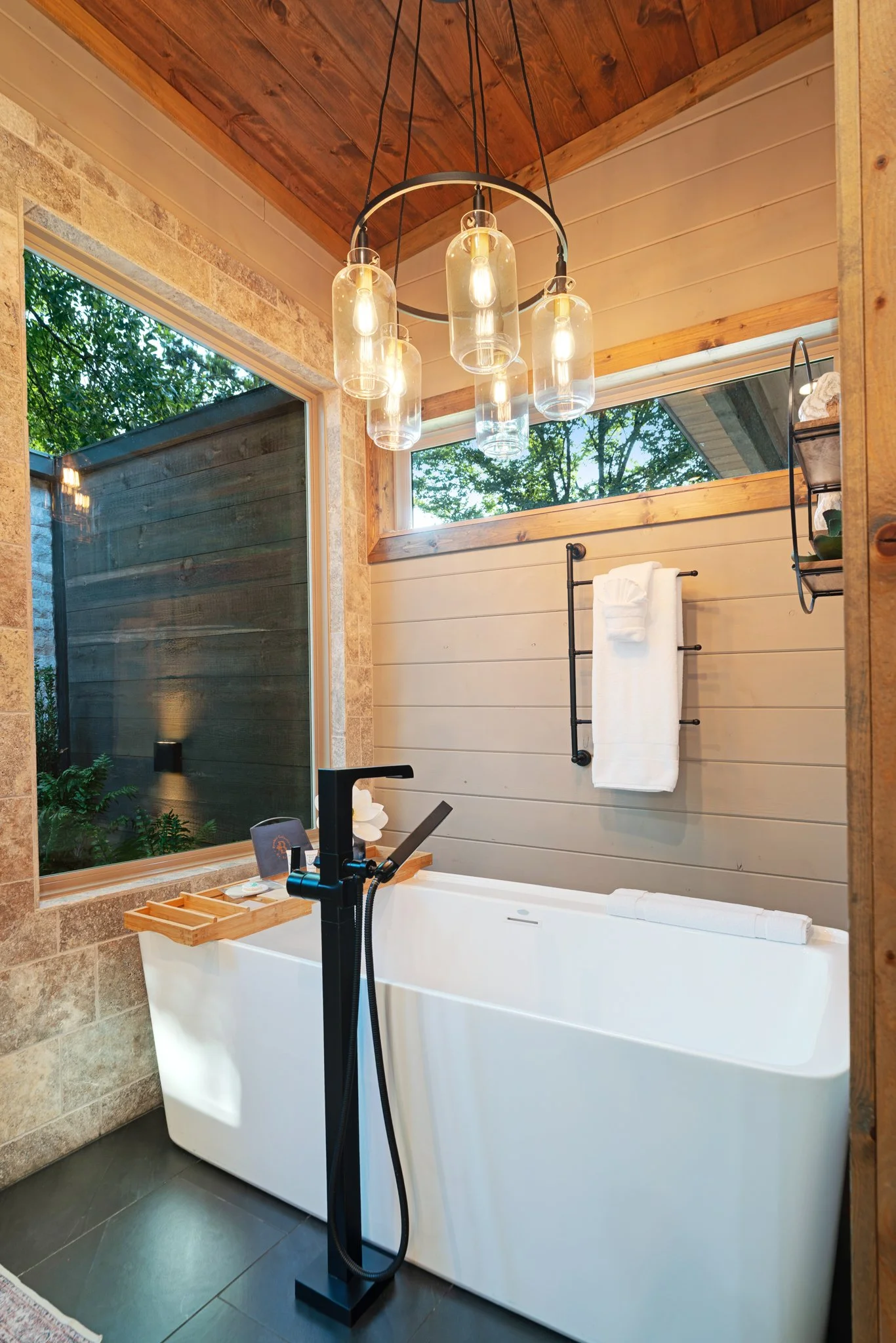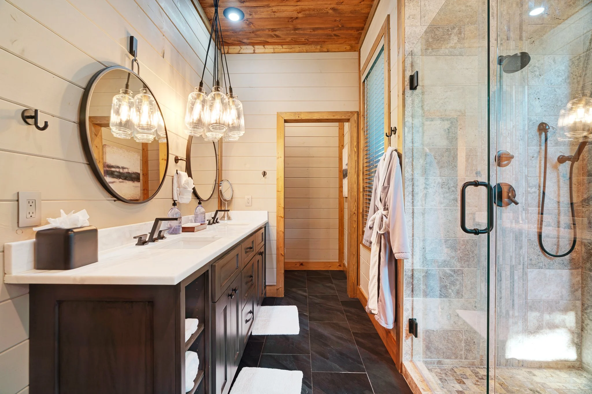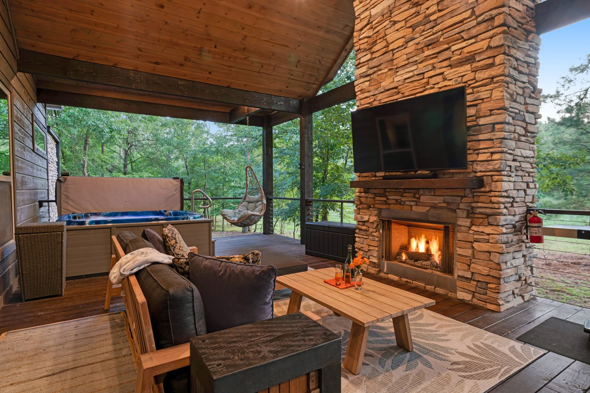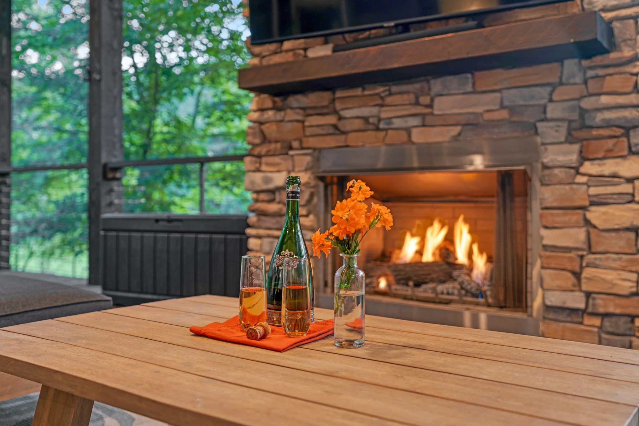 The sixteen-foot ceilings and open concept design of this two-bedroom cabin make it feel spacious while the indoor fireplace and the décor offer a cozy, intimate feeling at the same time. The kitchen, dining, and living areas are all open to each other—providing the perfect place for guests to gather with friends and family. The living room is set up with a sixty-five-inch flat screen smart T.V. with DirecTV connection and a Bluetooth compatible soundbar. The kitchen is equipped with all stainless steel Kitchen Aid appliances, quartz countertops, and stocked with cooking and serving utensils for guests to prepare a full meal. Gray Fox also offers a full coffee bar with a small starter kit to get you through your first morning.