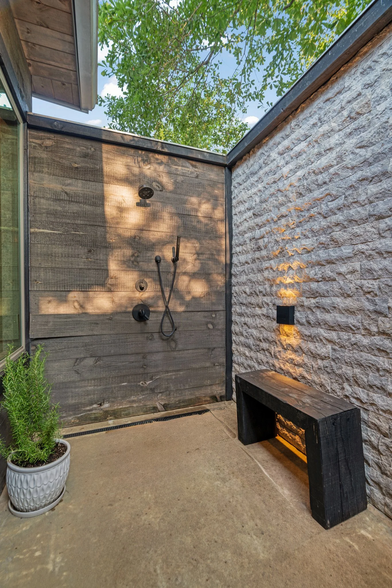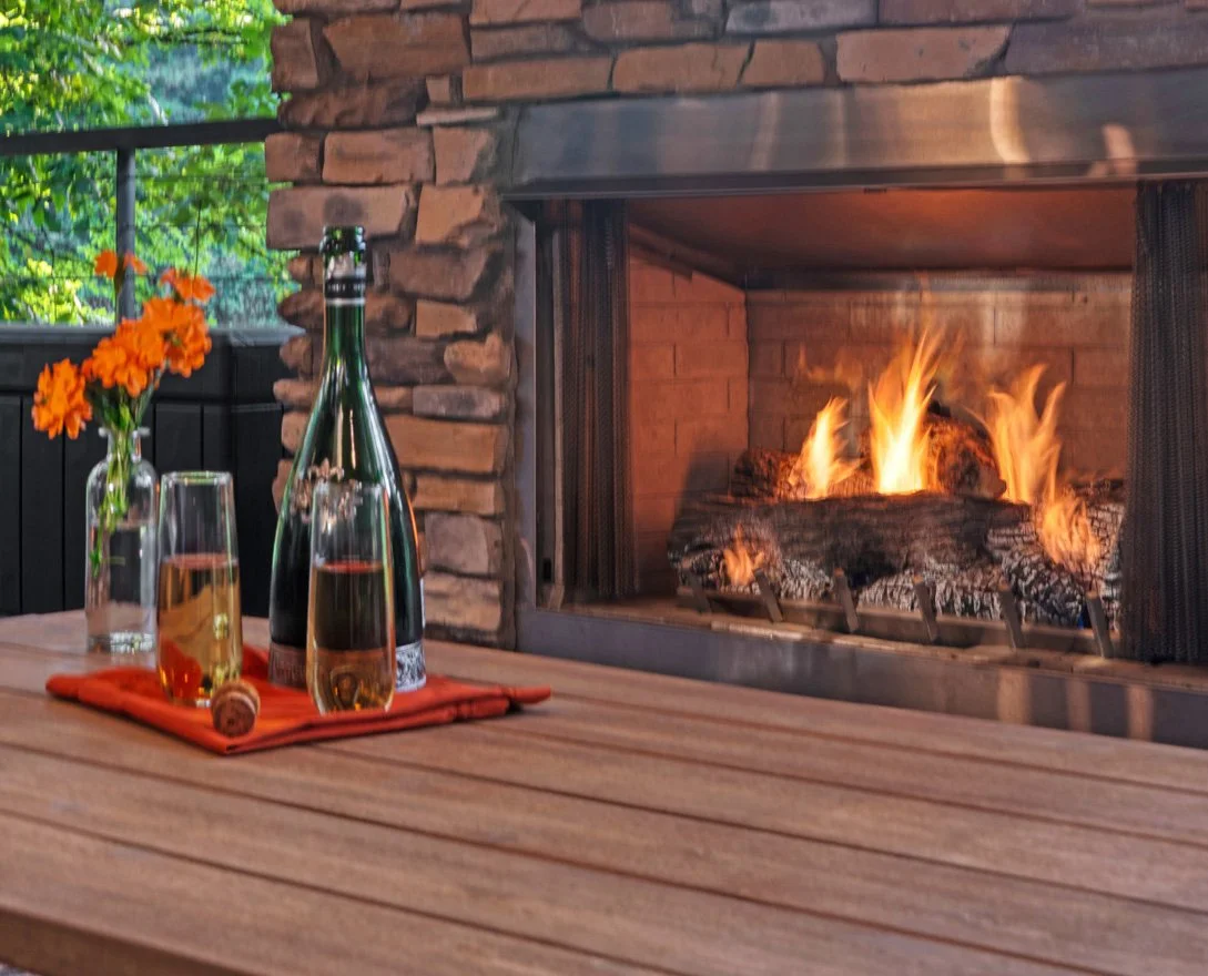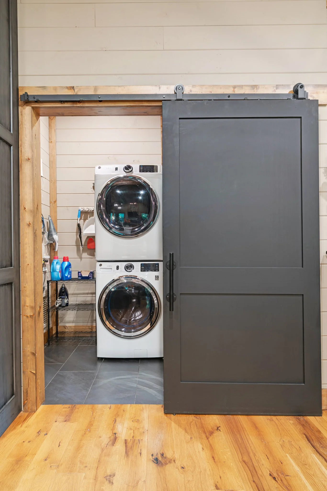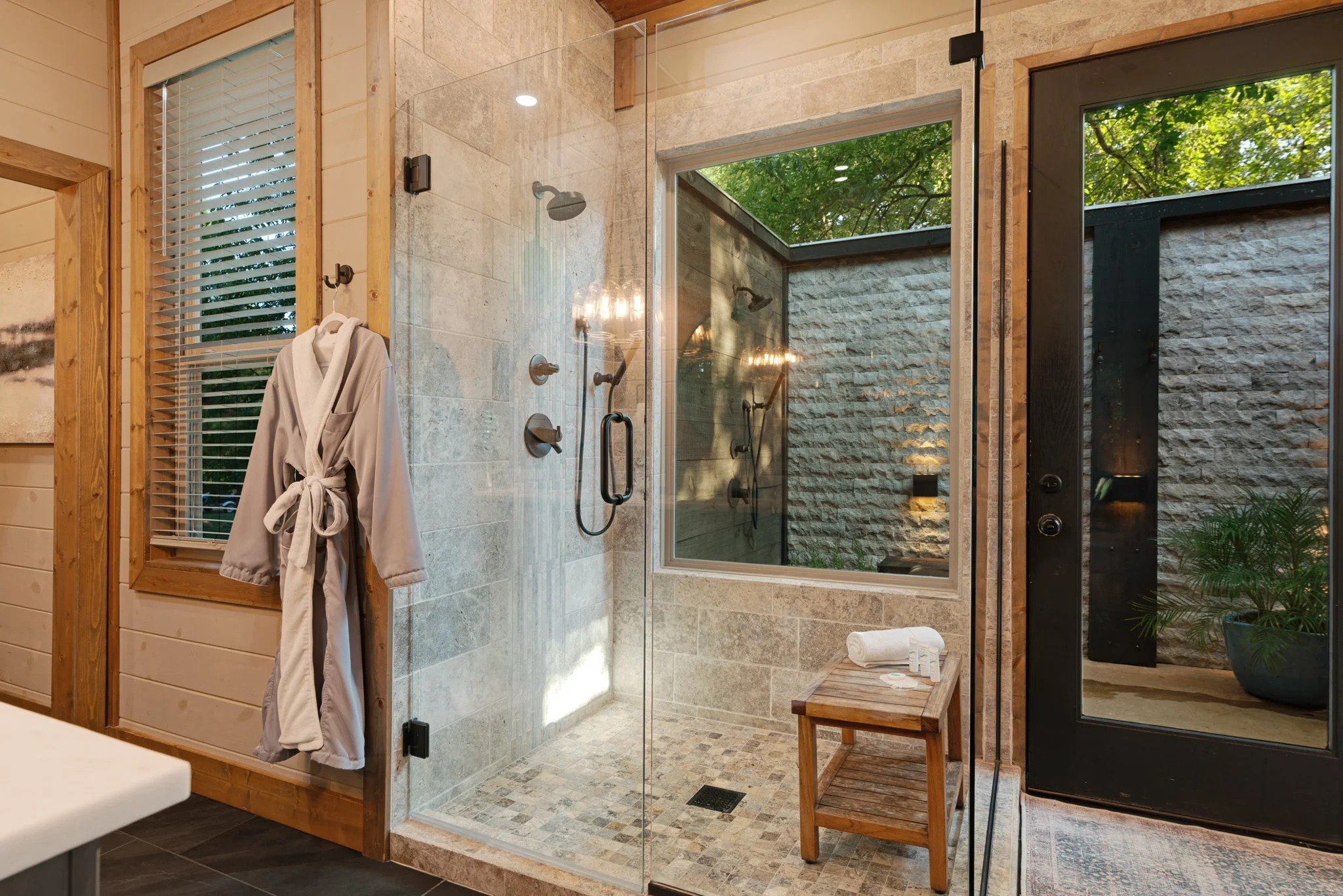 The sixteen-foot ceilings and open concept design of this two-bedroom cabin make it feel spacious while the indoor fireplace and the décor offer a cozy, intimate feeling at the same time. The kitchen, dining, and living areas are all open to each other—providing the perfect place for guests to gather with friends and family. The living room is set up with a sixty-five-inch flat screen smart T.V. with DirecTV connection and a Bluetooth compatible soundbar. The kitchen is equipped with all stainless steel Kitchen Aid appliances, quartz countertops, and stocked with cooking and serving utensils for guests to prepare a full meal. Gray Fox also offers a full coffee bar with a small starter kit to get you through your first morning.