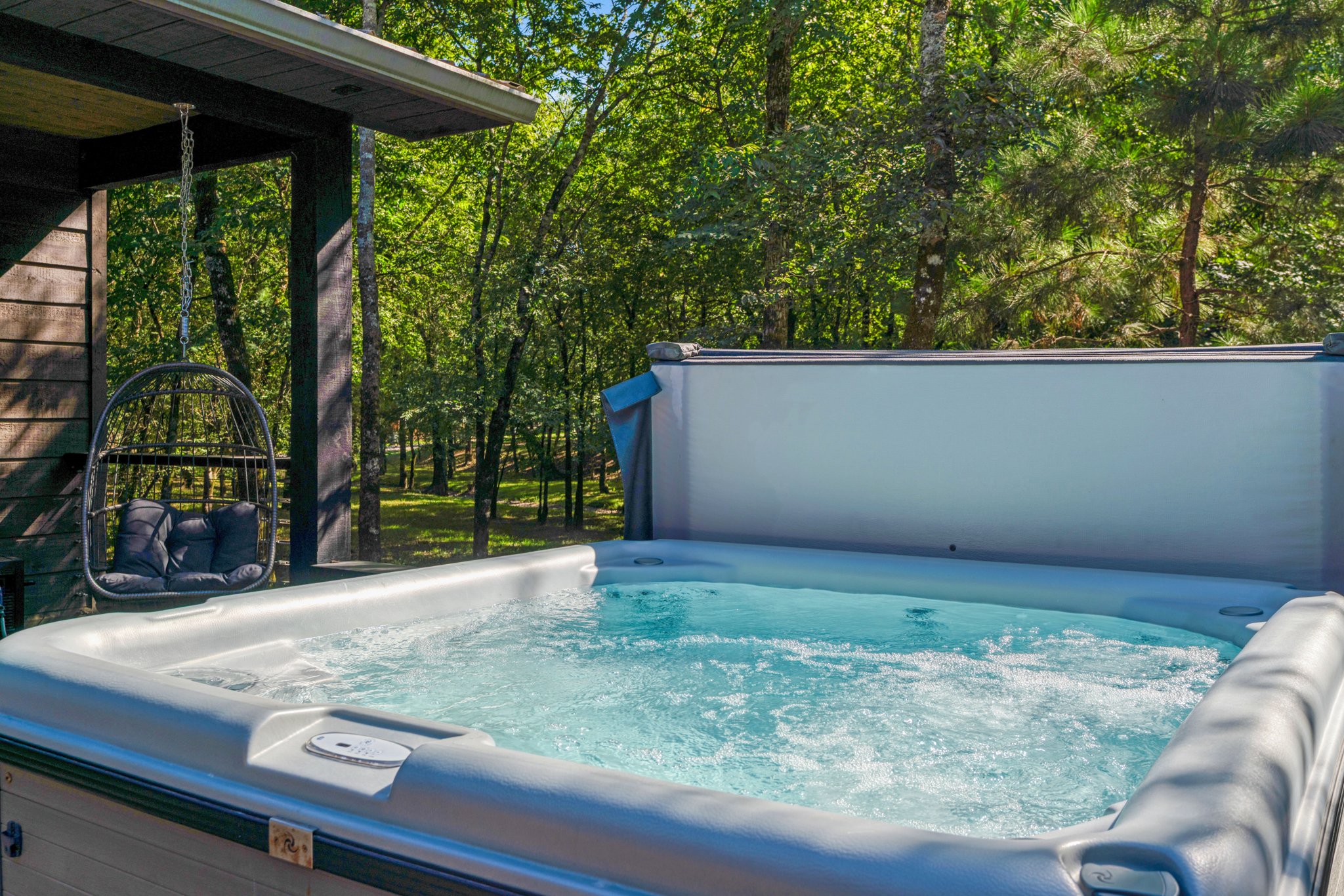 One of the main draws to the Hochatown area is its beautiful scenery and wonders of nature. Exiting through the wall to wall glass doors, Gray Fox offers a large covered deck, as well as a large uncovered deck for stargazing. This area is complete with plenty of comfortable seating surrounding the beautiful seven-foot long gas fire pit. The cabin also includes a fire pit in the backyard with seating for evenings by a cozy wood fire and a gas grill is provided for any outdoor cooking and entertaining for guests to enjoy. To top your outdoor experience, take a long relaxing soak in the evening in our six-person uncovered hot tub with a beautiful view of the stars.