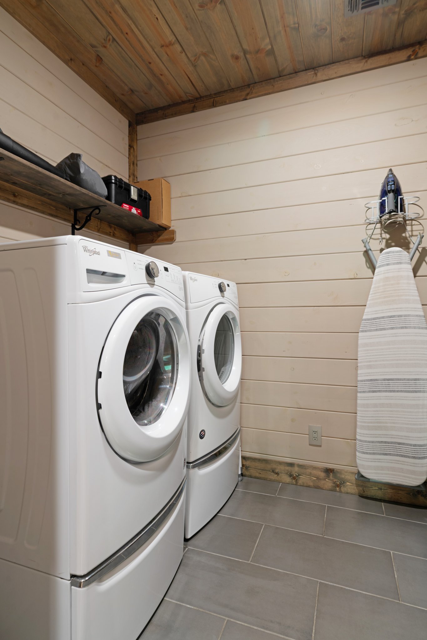 Gray Fox with its two master bedroom suites is beautifully appointed with king-sized beds covered in luxurious bedding. Each suite has a sixty-five inch flat screen T.V. with DirecTV services. The En Suite bathrooms are equipped with quartz countertops, double sinks, lighted vanity mirrors, and floor to ceiling glass doors that open into the spacious showers with multiple shower heads. Each bedroom has French doors that open to their own outside deck. Gray Fox also offers a full laundry room and provides detergents for guests to use during their stay.